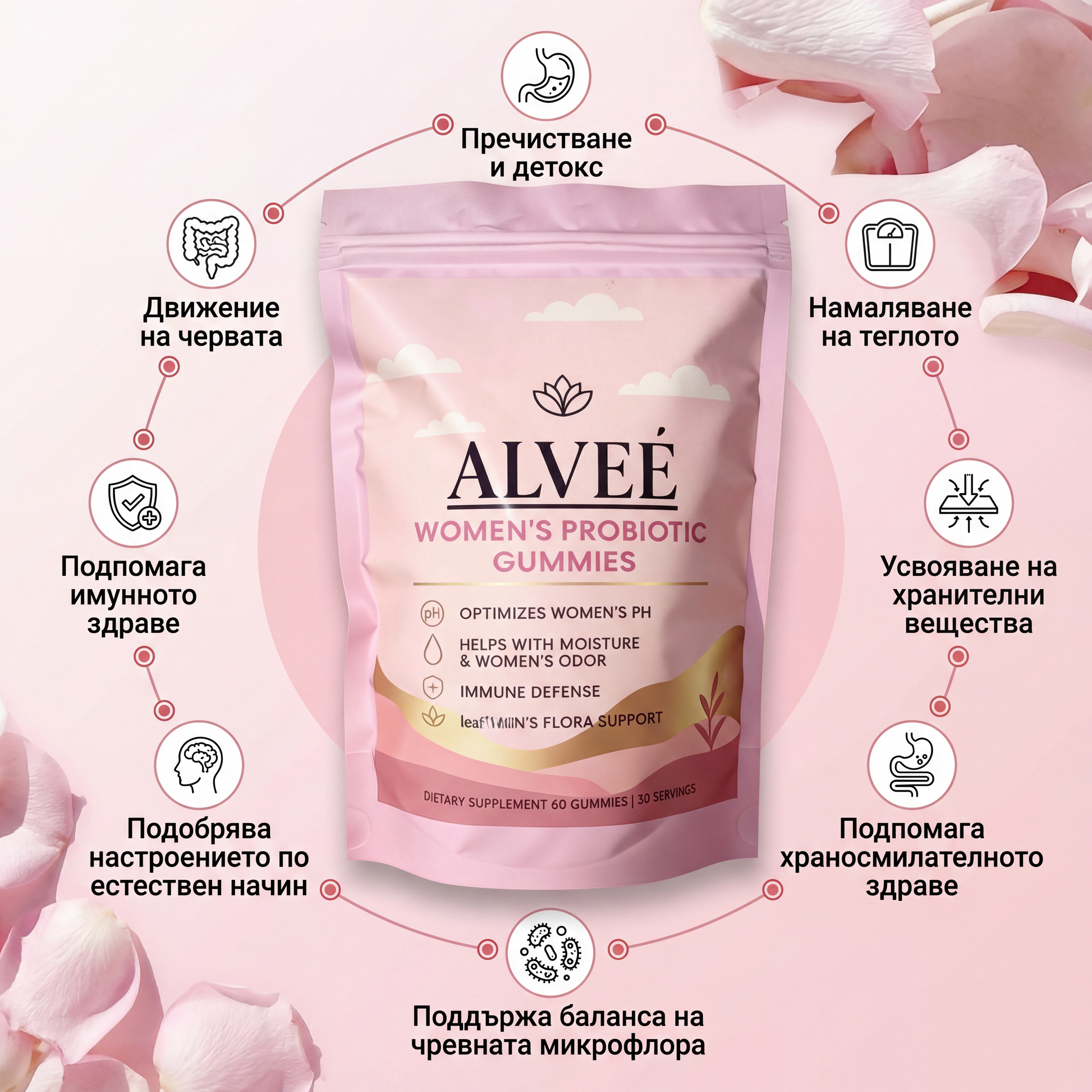 Погрижете се за интимното си здраве по най-лесния и естествен начин — с нашите вкусни пробиотични желани витамини. Специално създадени за нуждите на женското тяло, те подпомагат естествения баланс на микрофлората и поддържат оптимално pH, за да се чувствате свежи, защитени и сигурни всеки ден.